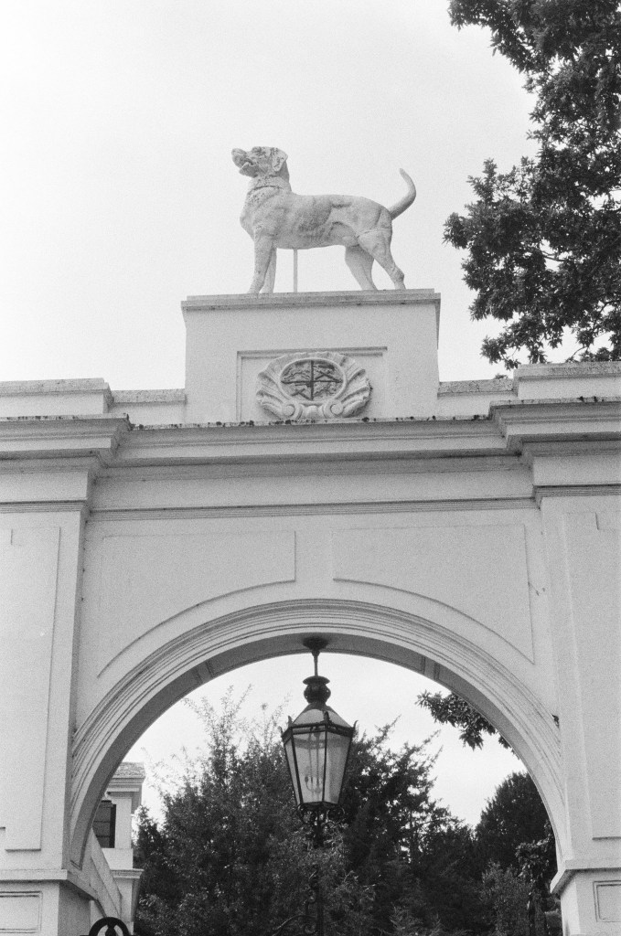 Bourne Hall was built on the site of Garbrand Hall, which was bought in 1795 by Thomas Hercey Barritt, who had ‘significant estates’ in Jamaica which were given to his family by Charles II, and who was responsible for the imposing ‘Dog Gate’ at the entrance to the park, with the Talbot hound whose tail is said to have been replaced by a cow’s horn from the local butcher. The house also had numerous occupants after Barritt’s death; it was at one time famous for its gardens, and later became the home of a film studio that never made any films, and a school for ‘the daughters of professional men’ which closed in 1953; and the house, which by that time had fallen into disuse and disrepair, was demolished in 1962.