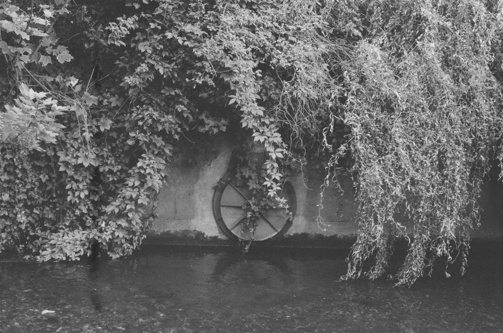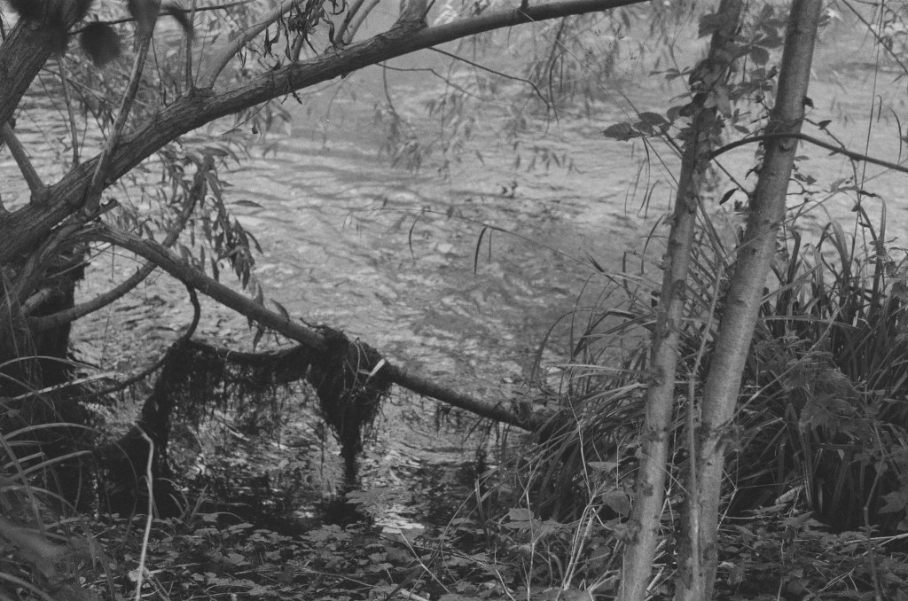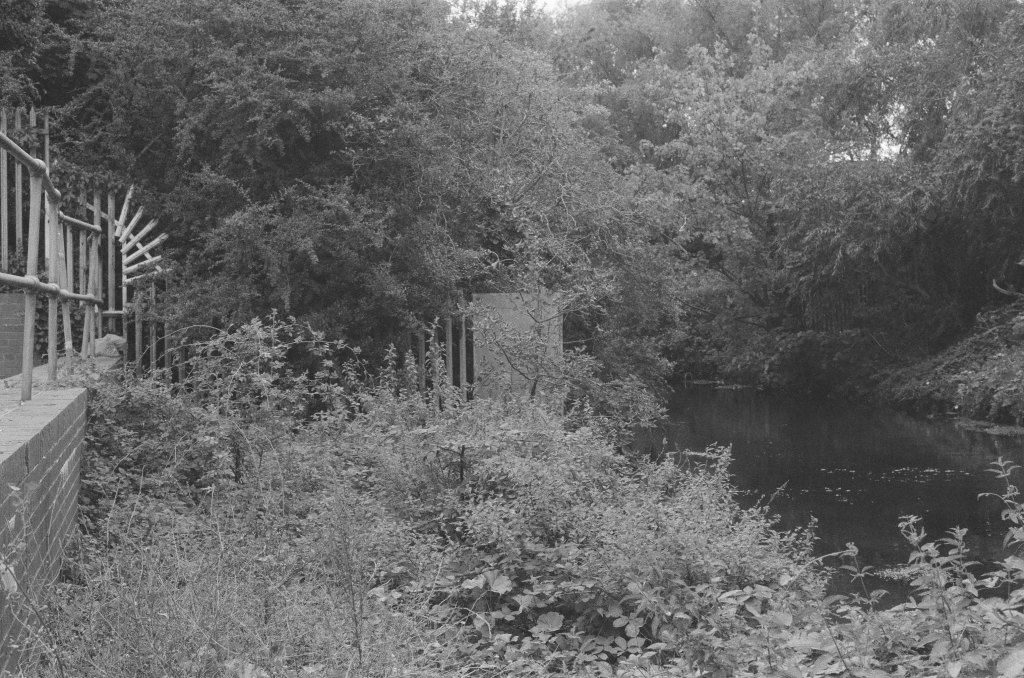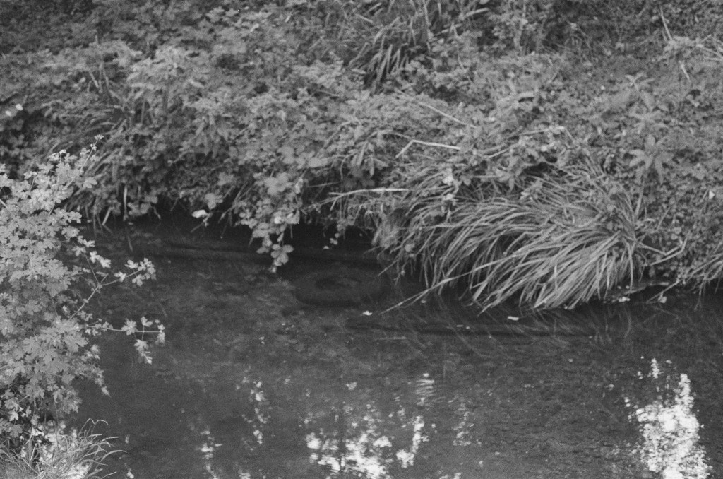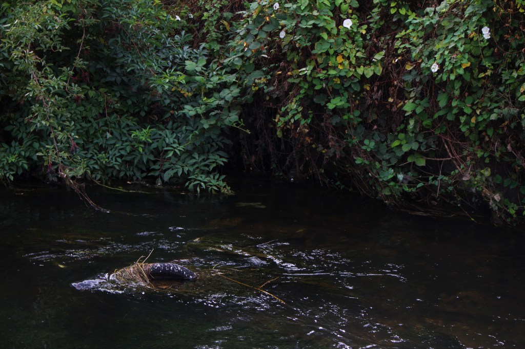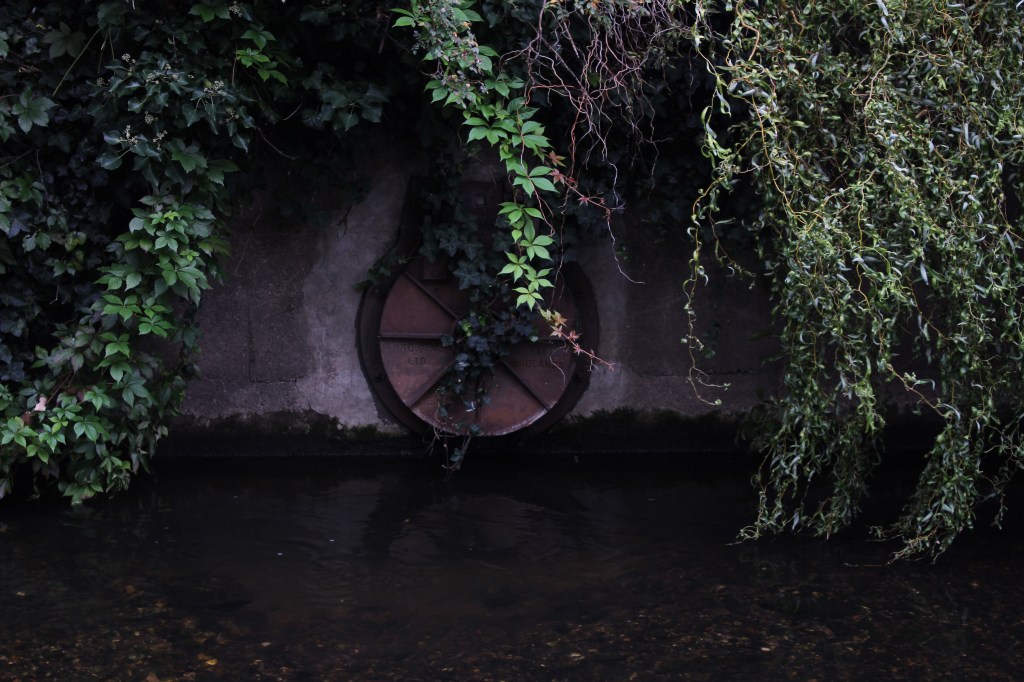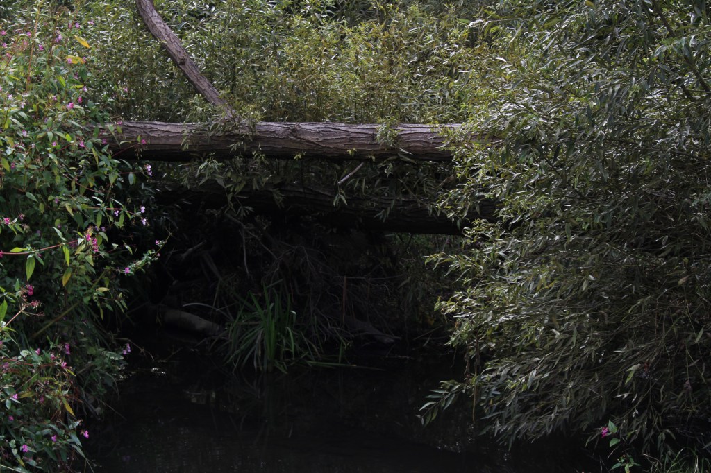 Finding the river again is like arriving in the ‘Zone’ in Stalker – not least in the industrial ‘zone’ that you have to pass through to get there, the huge concrete tanks and filter beds of the Hogsmill Sewage Treatment Works – and at first I thought I was lost as I wandered past garage doors, a discarded shopping trolley, and what appeared to be some sort of shrine, and it was only the sudden appearance of two children that alerted me to the presence of a path, and the sudden transportation into what seemed like another green world.